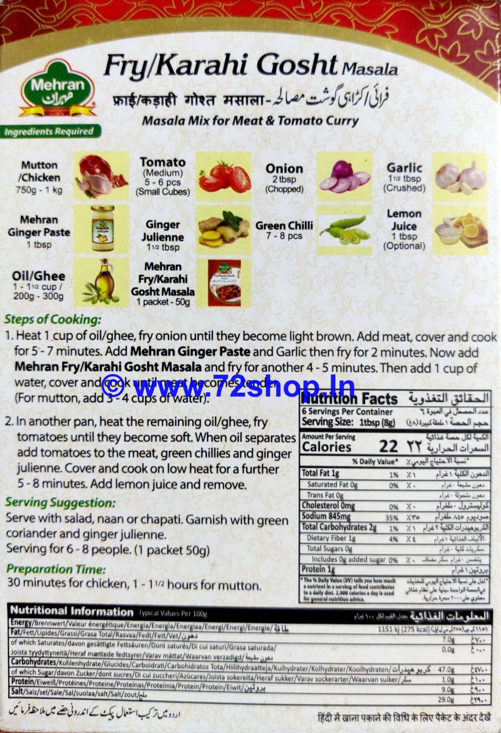 Mehran Karahi Masala is a blend of aromatic spices that adds a burst of flavor to your traditional Karahi dish.