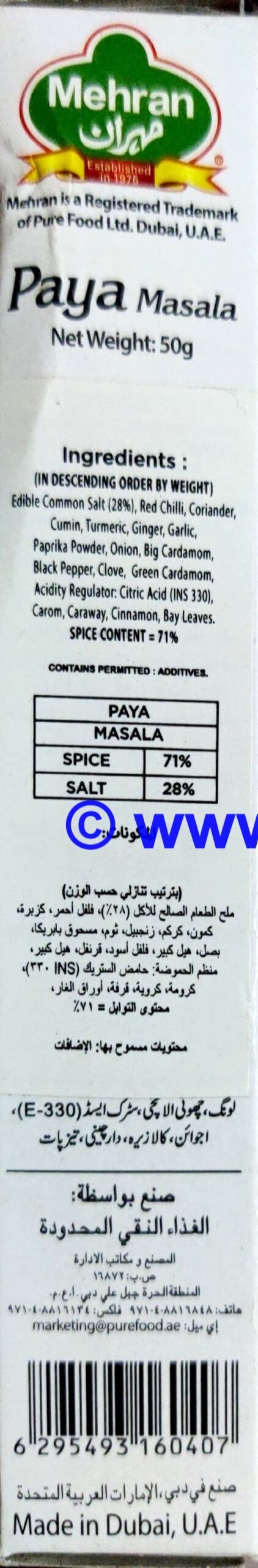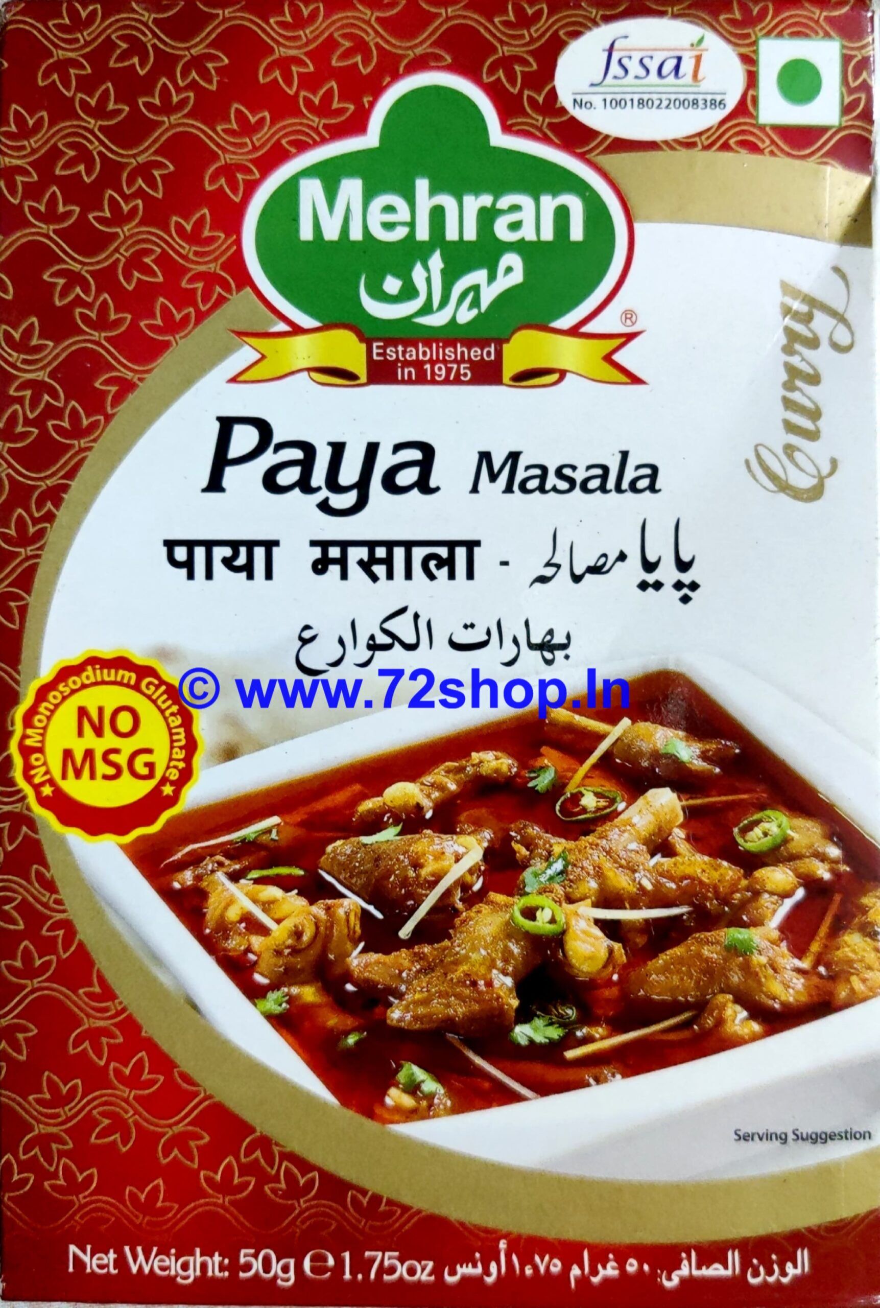 Mehran Paya Masala is a blend of spices that is used to prepare the traditional Desi dish, Paya. This masala is imported and made with the finest quality ingredients to ensure authentic flavor and aroma. The blend contains a mix of spices like cumin, coriander, cloves, cinnamon, and bay leaves that add a rich and savory taste to the dish. This 50-gram box is perfect for those who want to experience the taste of authentic Pakistani cuisine right at their home.